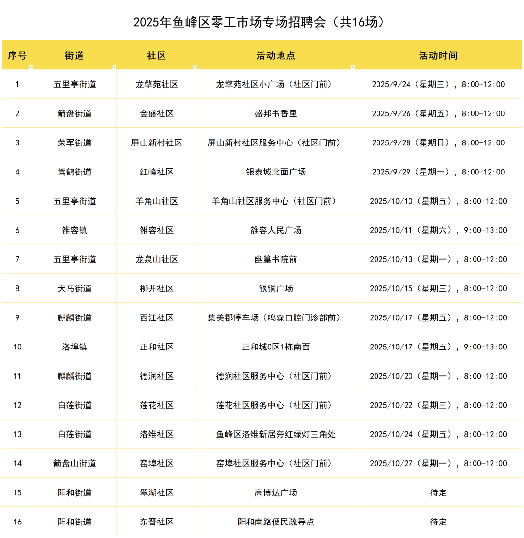 您好!随着经济结构调整和就业形势变化,大龄就业困难人员因技能单一、年龄限制等因素,面临求职难、就业不稳定等问题。为落实鱼峰区“稳就业、保民生”政策,精准帮扶该群体实现灵活就业,柳州市鱼峰区人力资源和社会保障局定于2025年9-10月组织开展2025年鱼峰区零工市场专场招聘会活动(共16场),现诚挚邀请有用工需求的各企业报名参与,共同开辟用工新渠道。