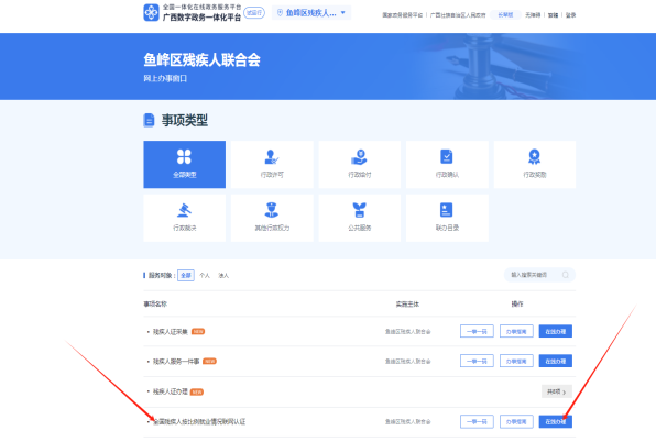 第二步:切换到柳州市鱼峰区,找到鱼峰区残疾人联合会,在“全国残疾人按比例就业情况联网认证”事项后面点击“在线办理”即可进入“按比例联网认证网报系统”。