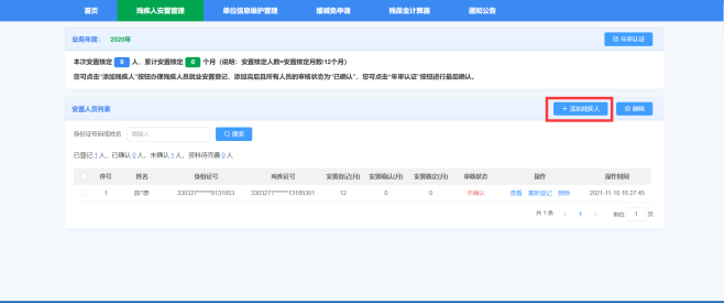 第四步,保存后,到“残疾人安置管理”中选择添加残疾人,在残疾人信息填报页面根据页面提示,填写相关信息,并点击下一步;系统通过联网数据对残疾人的就业情况进行认证,如有联网认证不通过的事项,根据系统提示上传相关凭证,提交相关材料,交由残联进行人工审核。