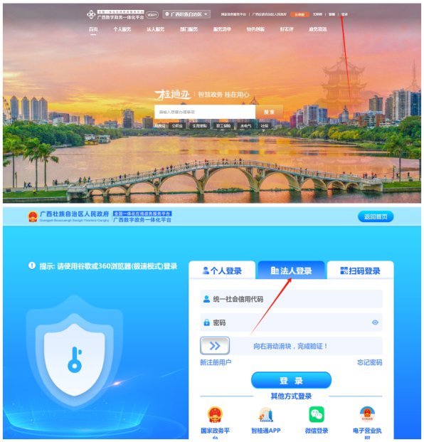 (一)网上申报:第一步:在互联网搜索“广西数字政务一体化平台”(http://zwfw.gxzf.gov.cn/)(超链接按住“Ctrl”+“鼠标左键”可打开)选择法人用户注册(首次办理用户需要)或登录。