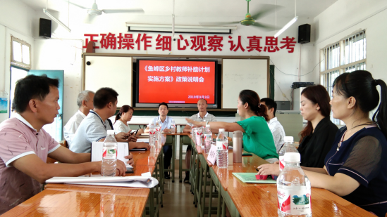 2019年9月3日上午9:30 — 10:30在里雍中学会议室,鱼峰区教育局举行了《鱼峰区乡村教师补助计划实施方案》政策说明会,区教育局副局长刘秀斌、办公室主任黄莉棋、办公室教研员金丽以及区政管办黄鹏、市政管办人员参加会议。