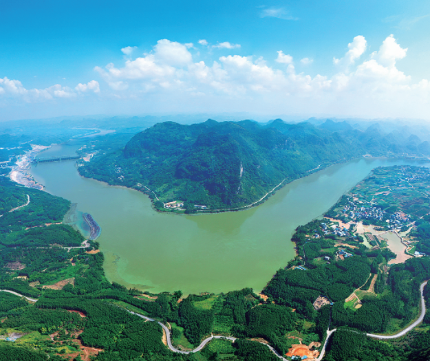 铜鼓湾从海拔约509米的铜鼓山下流过,登上铜鼓湾上的铜鼓山与“龙城之角”的旗山隔江相望,在山顶可见“江流曲似九回肠”的磅礴江景,也可见“高峡出平湖”的红花水电站盛景。