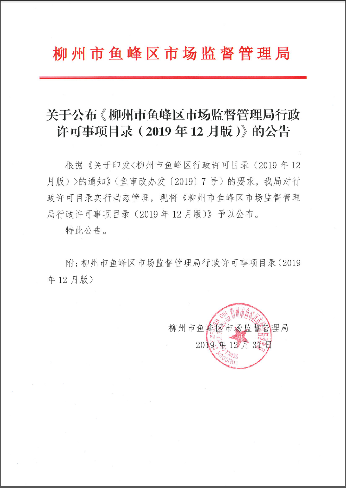 关于公布《柳州市鱼峰区市场监督管理局行政许可事项目录(2019年12月版)》的公告