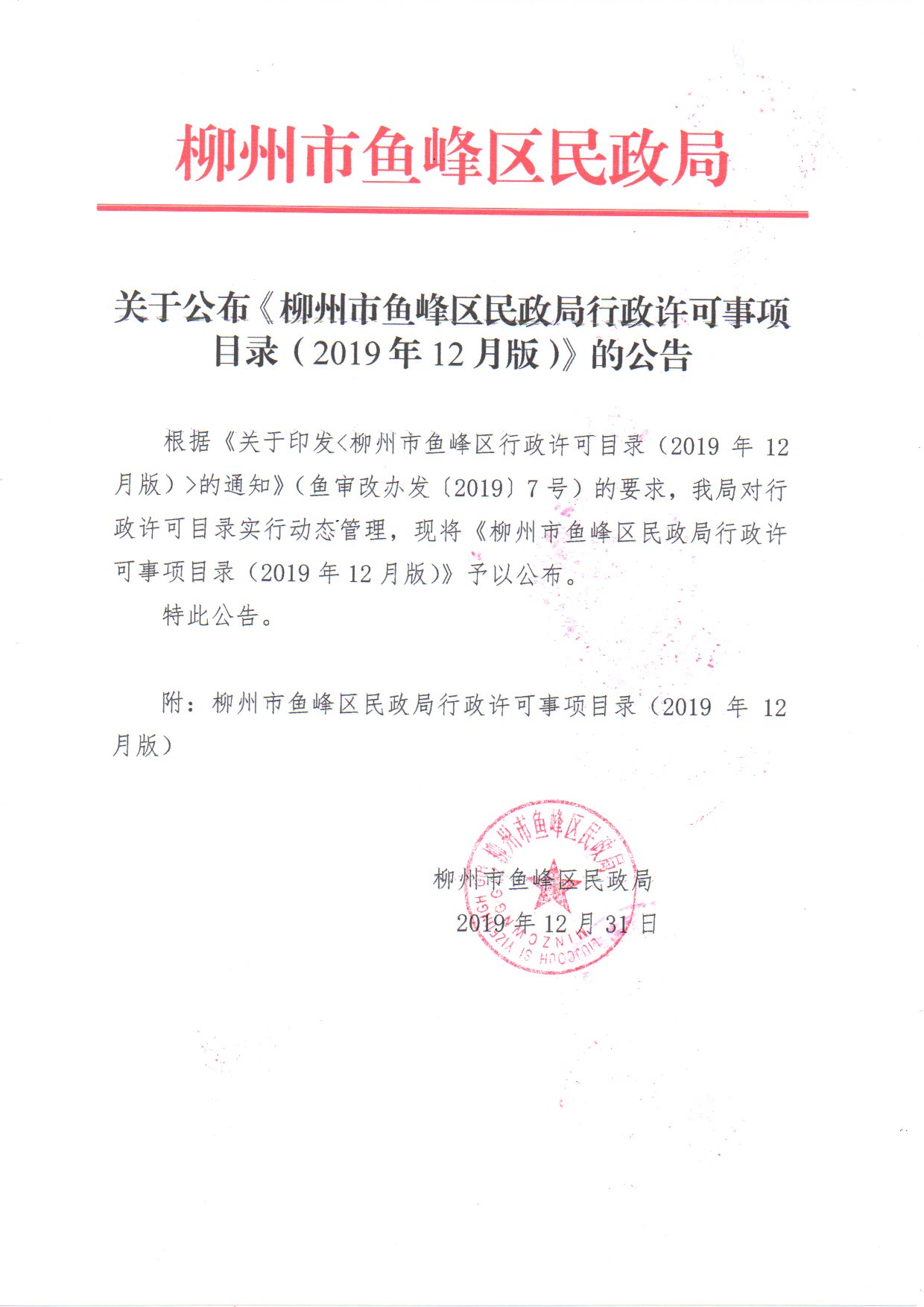 关于公布《柳州市鱼峰区民政局行政许可事项目录(2019年12月版)》的公告