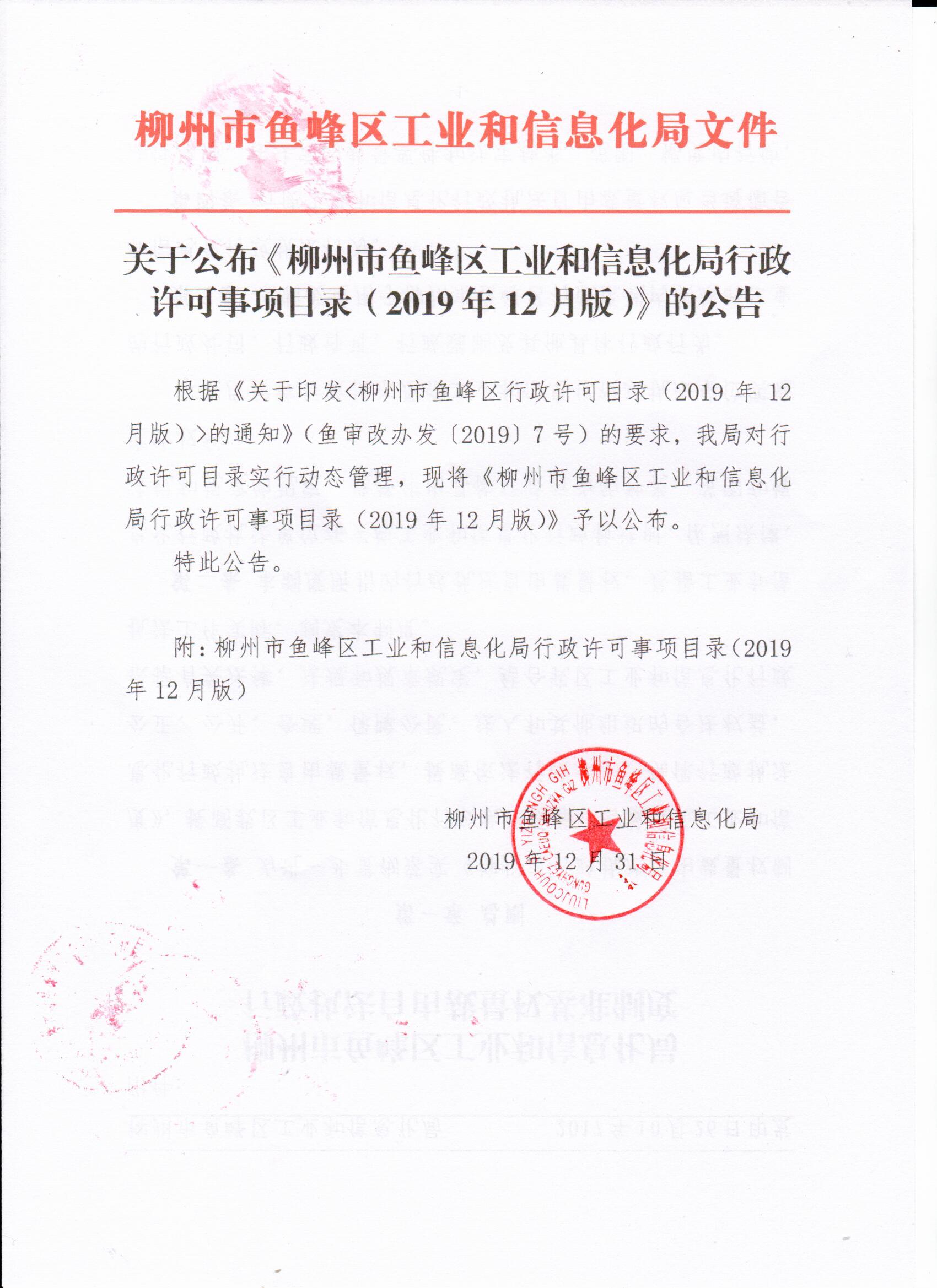 关于公布《柳州市鱼峰区工业和信息化局行政许可事项目录(2019年12月版)》的公告