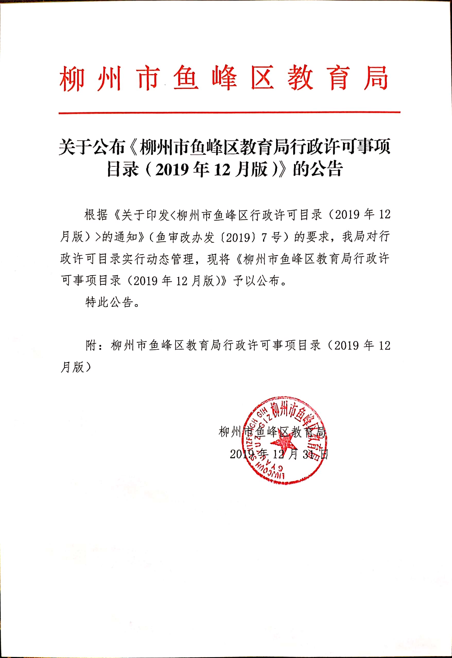 关于公布《柳州市鱼峰区教育局行政许可事项目录(2019年12月版)》的公告