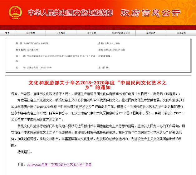 据了解,“中国民间文化艺术之乡”是1987年文化部为传承和弘扬我国优秀民间文化艺术、加强基层特色文化建设、丰富广大人民群众精神文化生活,促进经济、政治、文化、社会全面发展而设立的文化品牌项目,每3年评选命名一次。 此次评选从2018年3月份启动,经过市级初选、省级审核、全国复审自下而上逐级推荐申报,最终评选而出。