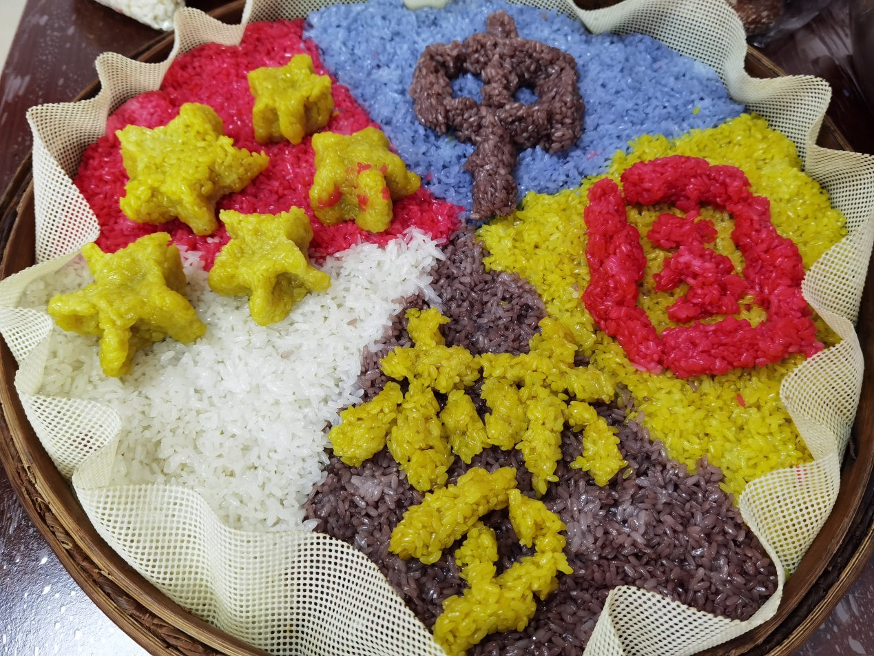 通过开展学党史,增长历史知识;颂党恩,颂扬宣传党的光辉历程和丰功伟绩;跟党走,坚定政治信念,把党史学习教育同做好当前民族团结进步创建工作有效结合起来,党员们用五色饭制作出党旗,绘制出“中国梦”。