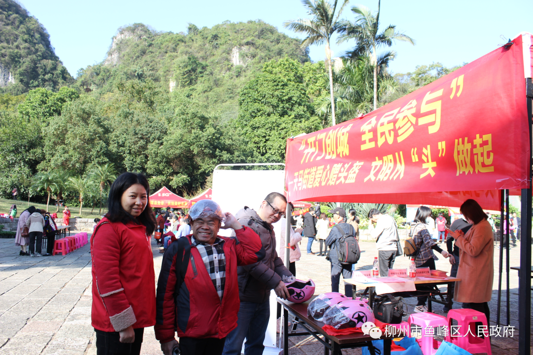 现场开展“开门创城、全民参与”爱心赠头盔活动,发放创城宣传页。