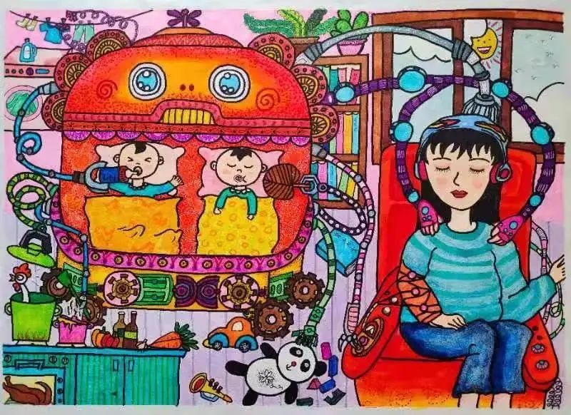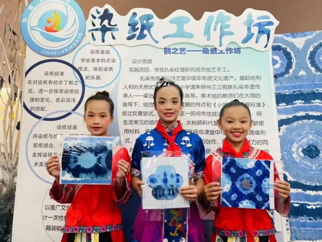 例如学校以“鹤之艺”染纸艺术工作坊为平台,在全校范围内极力推广《基于本土文化资源的美术单元化课题研究》成果,设计安排了以“走进非遗文化”为主题的扎染艺术——染纸活动,学生每学期会有2到3节课的染纸专项体验学习。学校还根据各个年级学生的学习能力,结合信息、科学等学科,开展电脑绘画和科幻画教学。