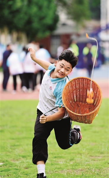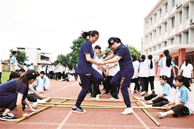 在市凤凰中学,伴随音乐的节拍,背篓接绣球、竹竿舞、踢毽子等花样竞技活动轮番上阵。该校大课间融入民族特色体育运动项目,弘扬传统文化,培养师生对体育运动的兴趣。