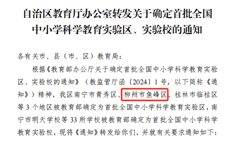 近日,教育部办公厅印发了《教育部办公厅关于确定首批全国中小学科学教育实验区、实验校的通知》,柳州市鱼峰区被教育部确定为首批全国中小学科学教育实验区,广西壮族自治区仅三个城区获确定,柳州市鱼峰区成为柳州市唯一获确定县区!