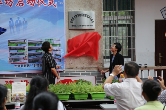 鱼峰区政府副区长黄小荣、鱼峰区人社局局长宋志红为“鱼峰区龙擎苑社区技能培训工作坊”揭牌。