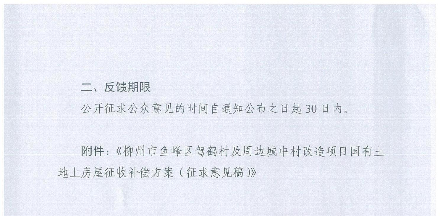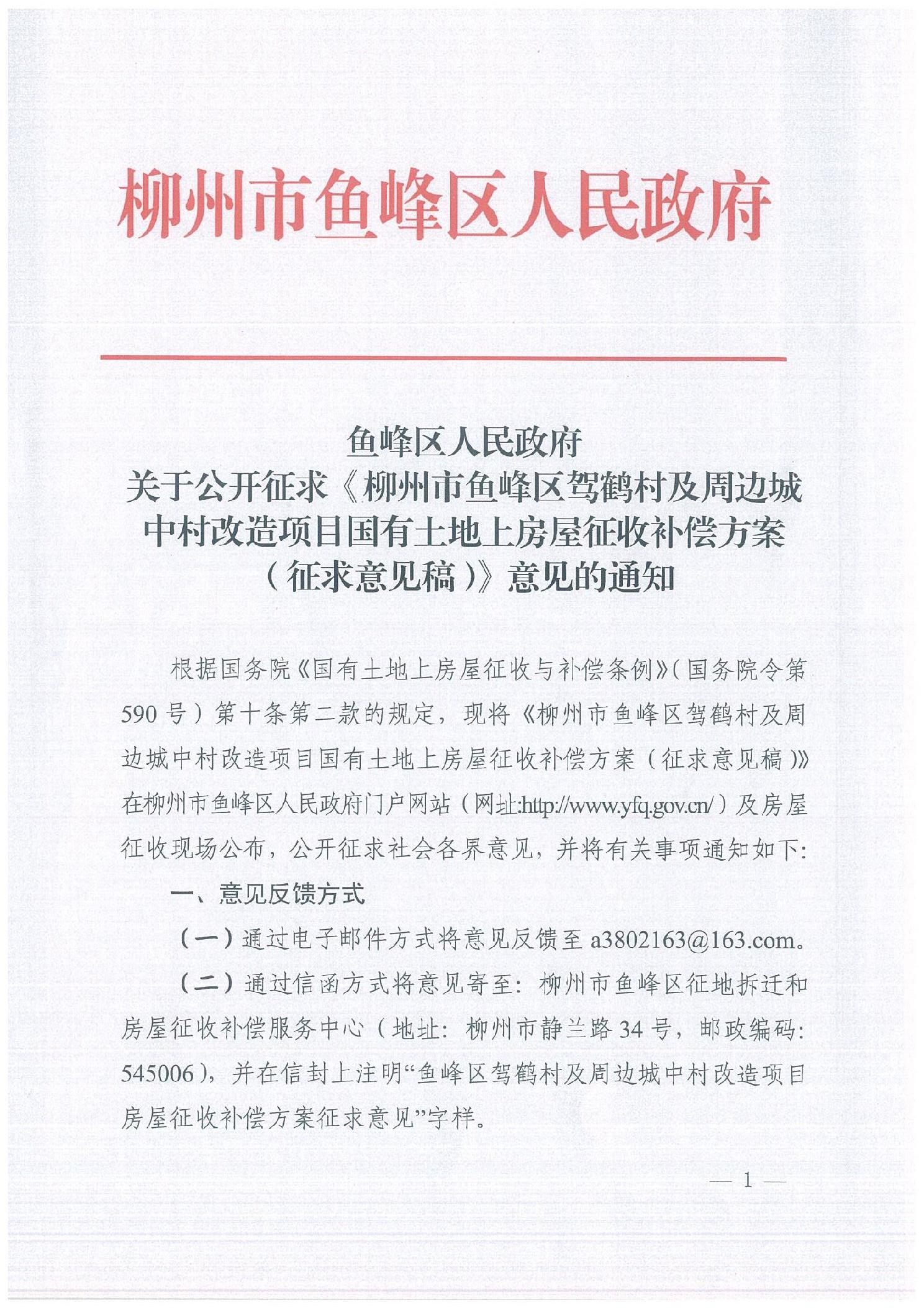 关于公开征求《柳州市鱼峰区驾鹤村及周边城中村改造项目国有土地上房屋征收补偿方案》意见的通知