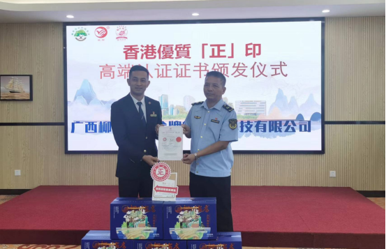 10月12日上午,广西柳州饭店金牌螺蛳粉食品科技有限公司负责人向前来颁发香港优质“正”印高端认证证书的鱼峰区市场监管局局长韦柳云说道。香港优质“正”印是香港市场上最受欢迎的产品认证标志之一,已成为消费者对食品安全和质量的信心指标。获得香港优质“正”印认证的企业能够借助香港标准及检定中心 (以下简称STC)帮扶,还可借助STC在香港地区、欧美日及众多英联邦国家的质检互认机制,更好地拓展国际市场。