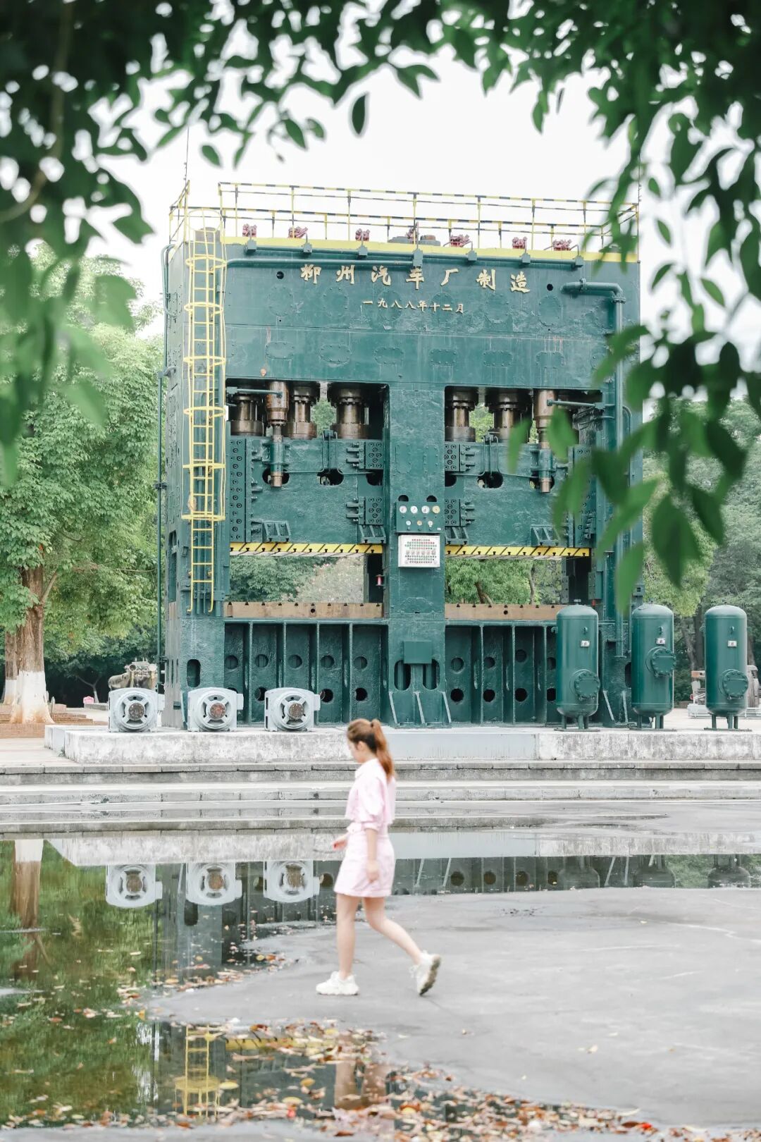 网红打卡点推荐:东广场水池红砖墙、3000吨压力机、汽油中压转子、列车书吧、650吨冲压机、时光长廊、Z435装载机、柳江牌汽车……