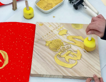 活动内容:木版年画是中国历史悠久的传统民俗文化艺术形式,通过在雕刻好图案“福禄寿喜”的木板上上色,把图案拓印再到方斗纸上,体验木版年画拓印过程