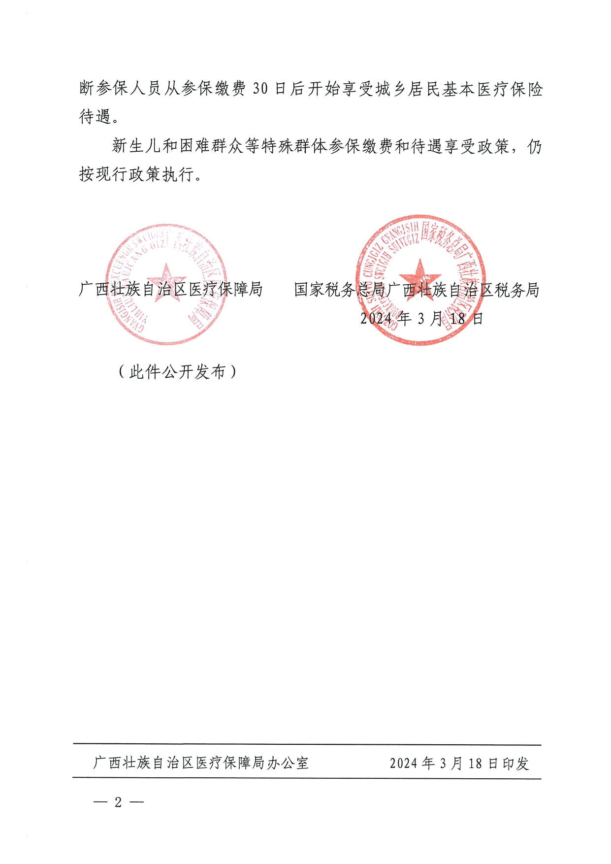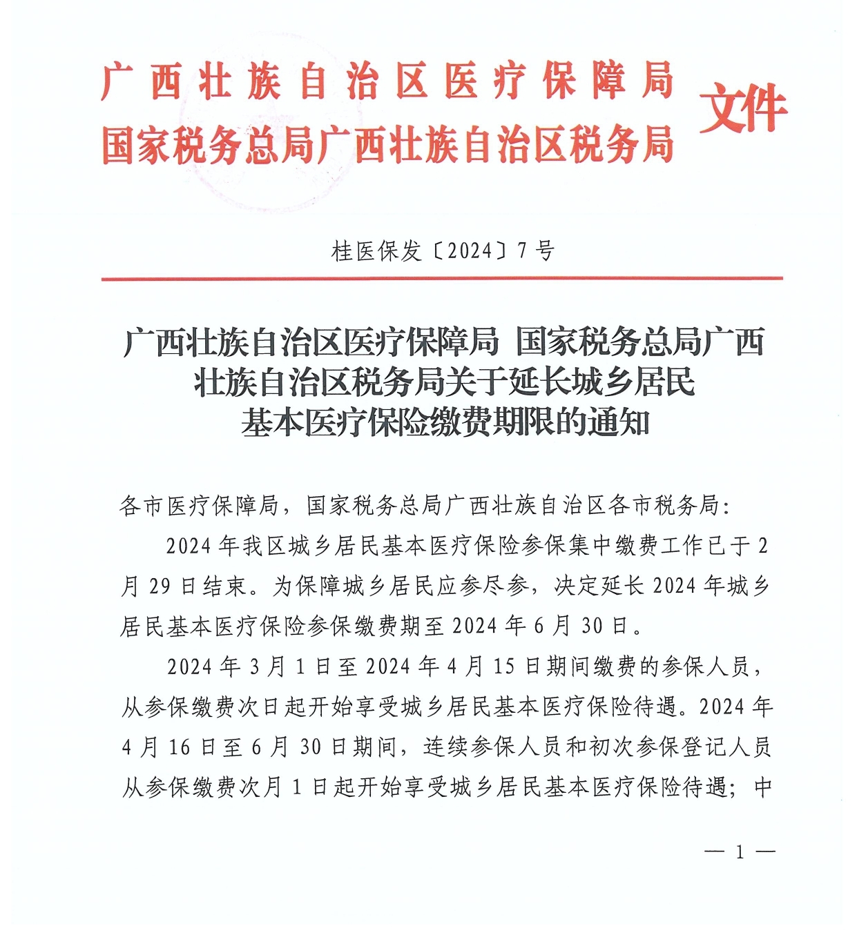 广西壮族自治区医疗保障局 国家税务总局广西壮族自治区税务局关于延长城乡居民基本医疗保险缴费期限的通知(桂医保发〔2024〕7号)
