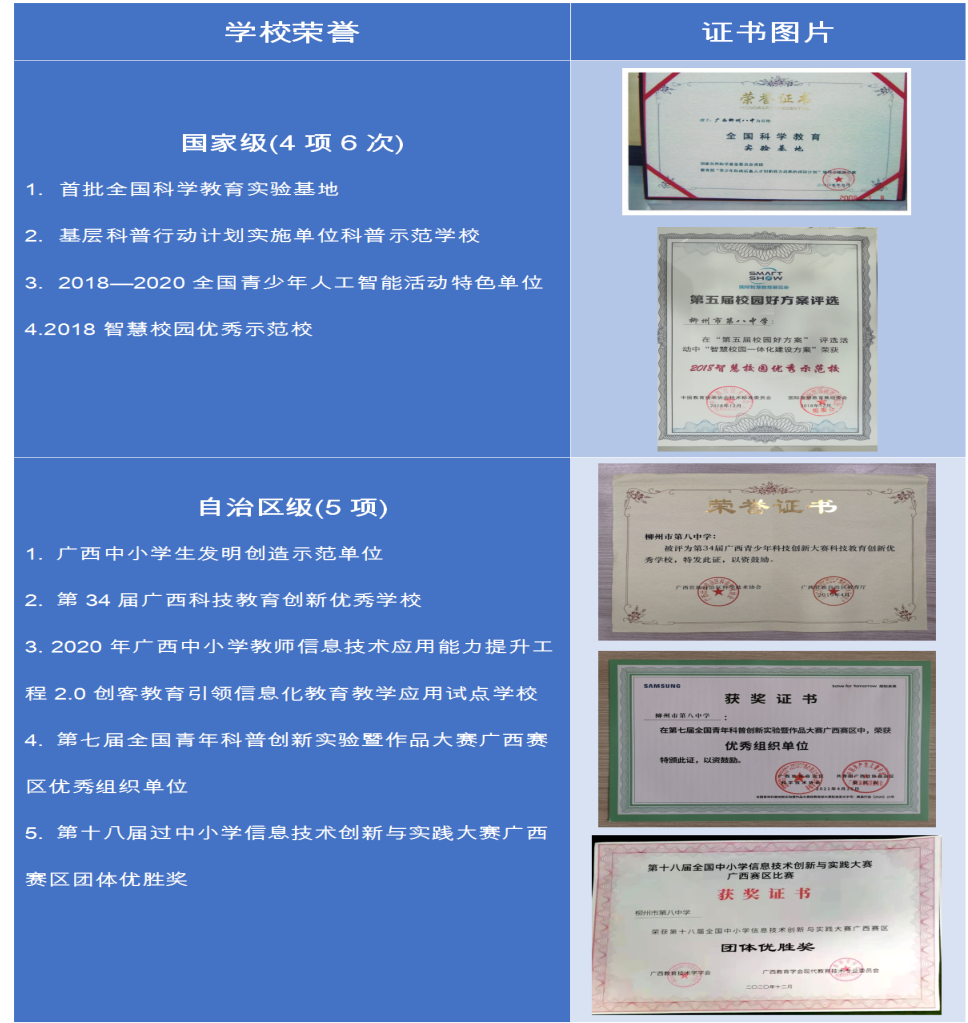 经过多年的探索与实践,柳州市第八中学科技创新教育形成了独具特色的创客教育模式,并取得了良好的育人效果和社会效应,学校也从一所普通初中成为了一所独具特色、引领地区的优质中学。近3年来,学生在科技活动中获得国家级奖励者多达30余人次,13级邓业阳、19级张先获第一届柳州市青少年科技创新市长奖,14级梁中昱获第一届广西青少年科技创新自治区主席奖。学校先后获“首批全国科学教育实验基地”、“全国青少年人工智能活动特色单位”、“教育部基层科普行动计划科普示范学校”、“全国智慧校园优秀学校”,“广西中小学生发明创造示范单位”等国家和自治区级荣誉称号。