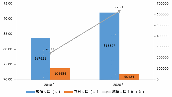 全区人口中,居住在城镇的人口为618827人,占92.51%;居住在乡村的人口为50134人,占7.49%。与2010年第六次全国人口普查相比,城镇人口增加231206人,乡村人口减少54350人,城镇人口比重提高4.74个百分点。