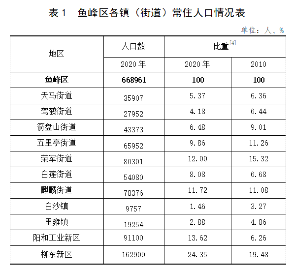 全区常住人口[3]为668961人,与2010年第六次全国人口普查的人相比,十年共增加176856人,增长35.94%,年平均增长率为3.12%。各镇(街道)人口分布情况(见表1)。