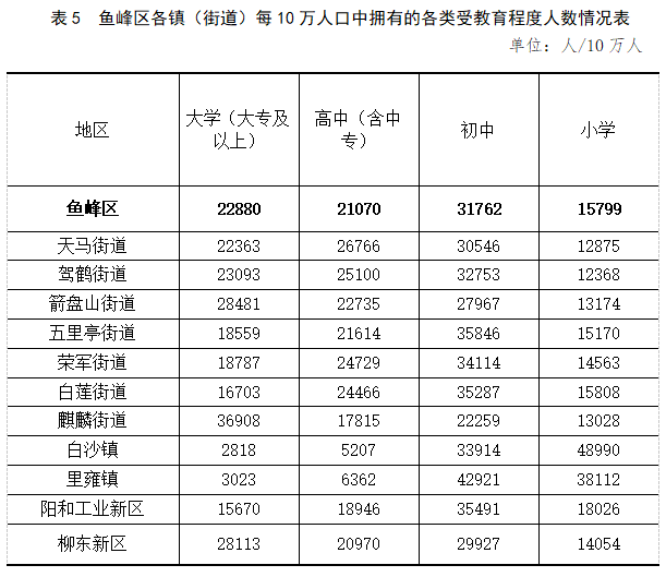 全区人口中,拥有大学(指大专及以上)文化程度的人口为153055人;拥有高中(含中专)文化程度的人口为140950人;拥有初中文化程度的人口为212475人;拥有小学文化程度的人口为105689人(以上各种受教育程度的人包括各类学校的毕业生、肄业生和在校生)。与2010年第六次全国人口普查相比,每10万人中拥有大学文化程度的由14296人增加到22880人;拥有高中文化程度的由20246人增加到21070人;拥有初中文化程度的由38711人减少到31762人;拥有小学文化程度的由18793人减少到15799人(见表5)。