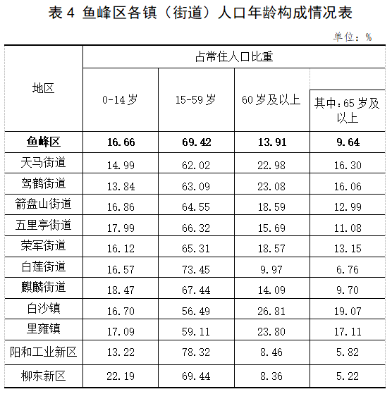 全区人口中,0-14岁[6]人口为111475人,占16.66%;15-59岁人口为464415人,占69.42%;60岁及以上人口为93071人,占13.91%,其中65岁及以上人口为64500人,占9.64%。与2010年第六次全国人口普查相比,0-14岁人口的比重上升2.14个百分点,15-59岁人口的比重下降4.96个百分点,60岁及以上人口的比重提高2.82个百分点,65岁及以上人口的比重提高2.36个百分点(见表4)。