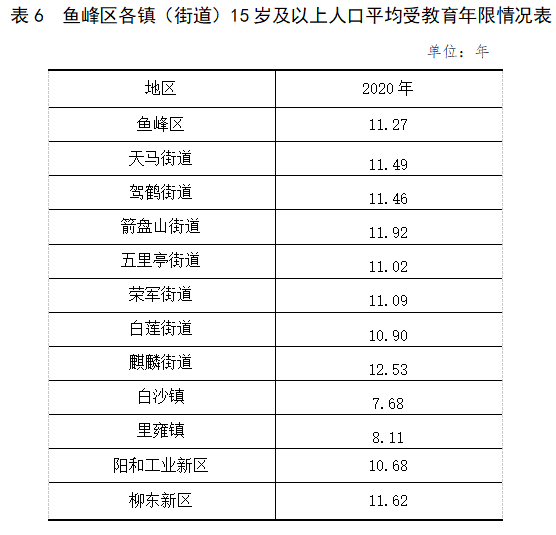 与2010年第六次全国人口普查相比,全区人口中,15岁及以上人口的平均受教育年限由10.91年增加至11.27年(见表6)。