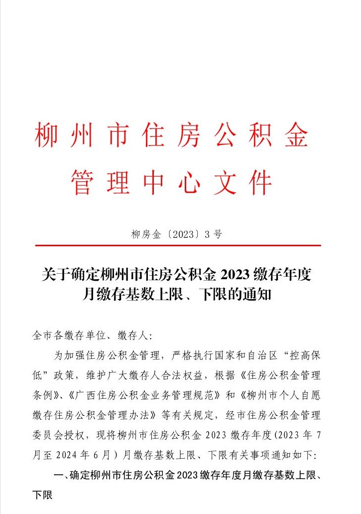 柳房金〔2023〕3号 关于确定柳州市住房公积金2023缴存年度月缴存基数上限、下限的通知