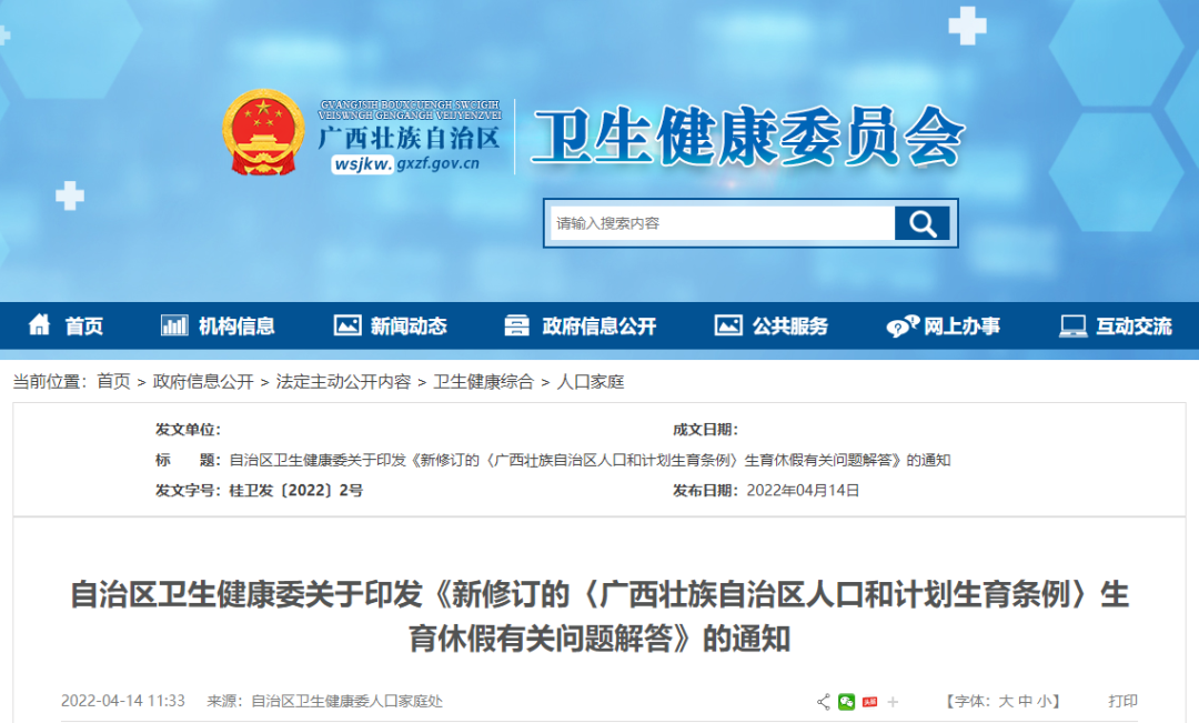 新修订的《广西壮族自治区人口和计划生育条例》(以下简称新《条例》)自2022年3月24日起施行。现就生育休假有关问题解答如下: