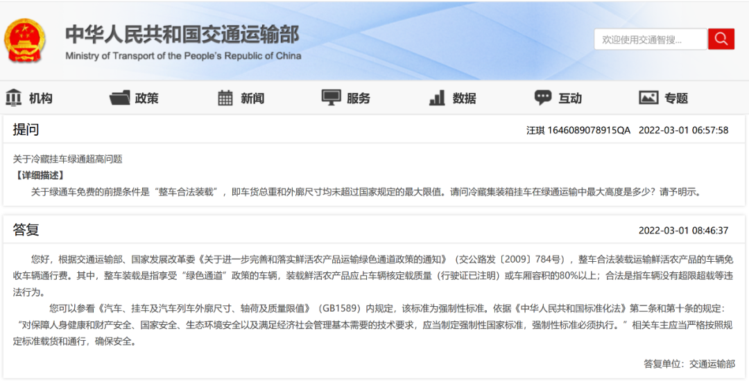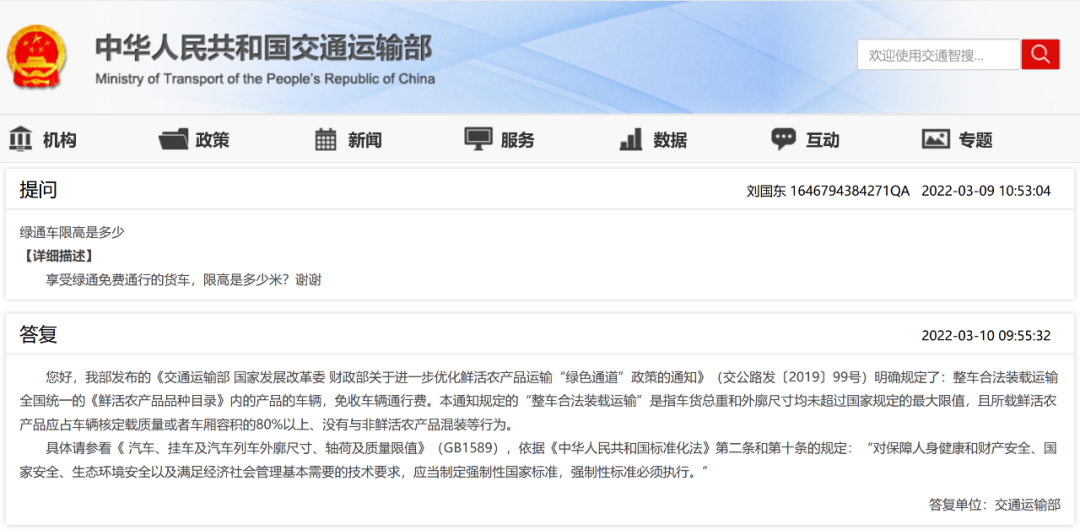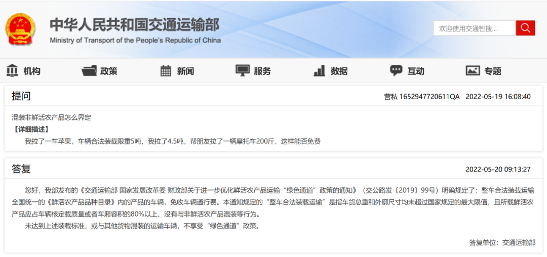 您好,我部发布的《交通运输部 国家发展改革委 财政部关于进一步优化鲜活农产品运输“绿色通道”政策的通知》(交公路发〔2019〕99号)明确规定了:整车合法装载运输全国统一的《鲜活农产品品种目录》内的产品的车辆,免收车辆通行费。本通知规定的“整车合法装载运输”是指车货总重和外廓尺寸均未超过国家规定的最大限值,且所载鲜活农产品应占车辆核定载质量或者车厢容积的80%以上、没有与非鲜活农产品混装等行为。