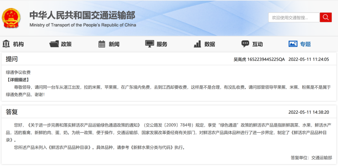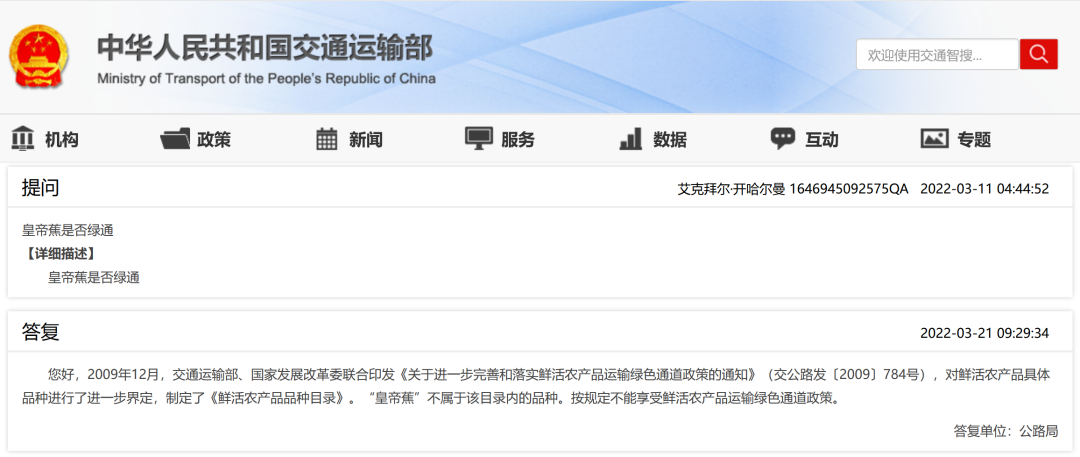您好,2009年12月,交通运输部、国家发展改革委联合印发《关于进一步完善和落实鲜活农产品运输绿色通道政策的通知》(交公路发〔2009〕784号),对鲜活农产品具体品种进行了进一步界定,制定了《鲜活农产品品种目录》。“皇帝蕉”不属于该目录内的品种。按规定不能享受鲜活农产品运输绿色通道政策。