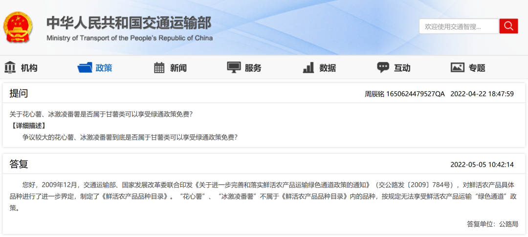 您好,2009年12月,交通运输部、国家发展改革委联合印发《关于进一步完善和落实鲜活农产品运输绿色通道政策的通知》(交公路发〔2009〕784号),对鲜活农产品具体品种进行了进一步界定,制定了《鲜活农产品品种目录》。“花心薯”“冰激凌番薯”不属于《鲜活农产品品种目录》内的品种,按规定无法享受鲜活农产品运输“绿色通道”政策。