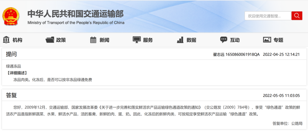 您好,2009年12月,交通运输部、国家发展改革委《关于进一步完善和落实鲜活农产品运输绿色通道政策的通知》(交公路发〔2009〕784号),享受“绿色通道”政策的鲜活农产品是指新鲜蔬菜、水果,鲜活水产品,活的畜禽,新鲜的肉、蛋、奶。因此,化冻后的新鲜肉类,可按规定享受鲜活农产品运输“绿色通道”政策。