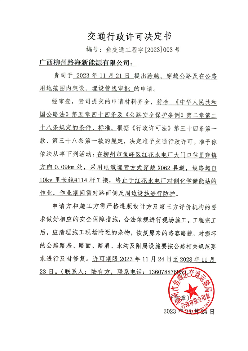 广西柳州路海新能源有限公司跨越、穿越公路及在公路用地范围内架设、埋设管线审批公路交通行政许可决定书