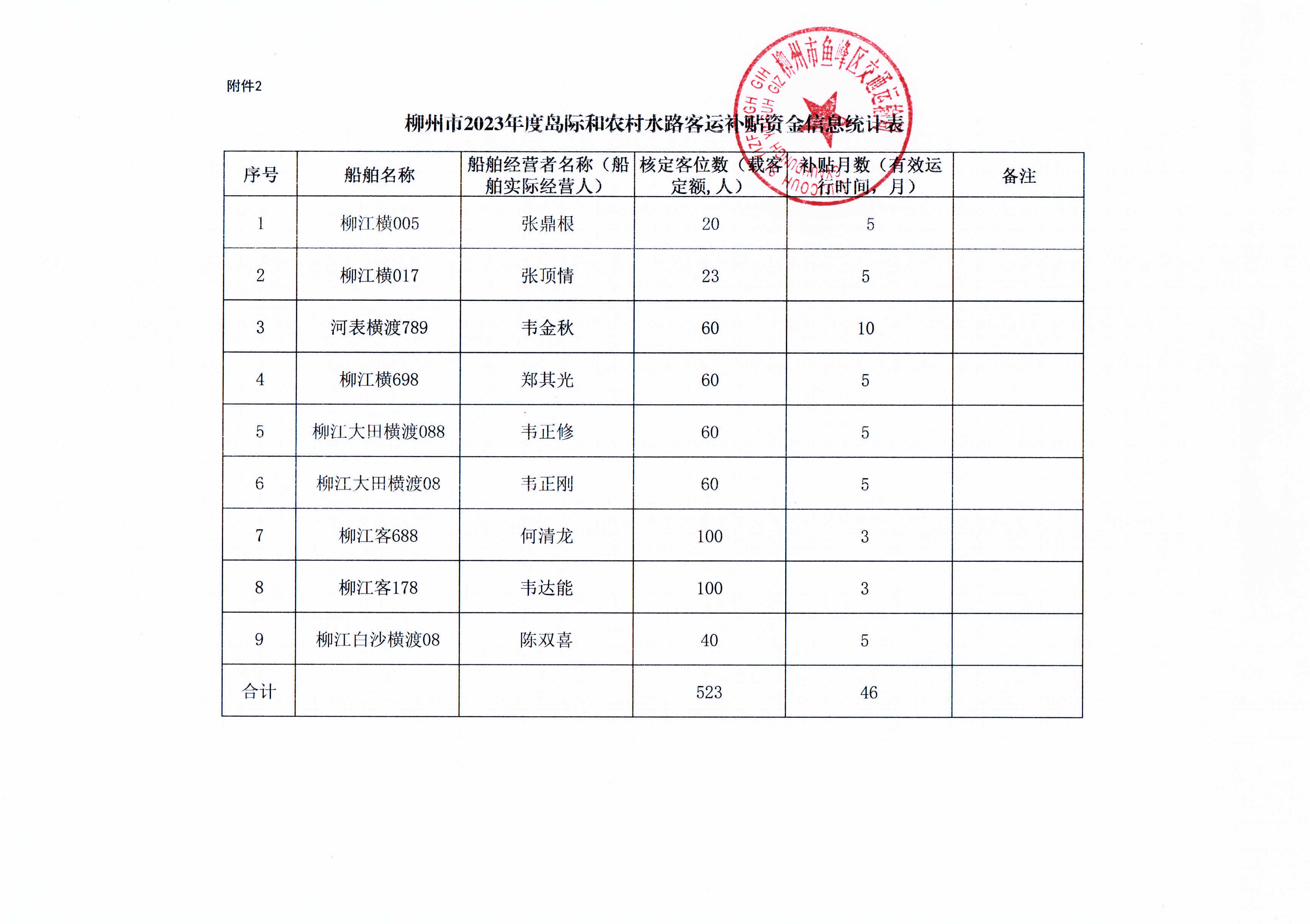附件:柳州市2023年度岛际和农村水路客运补贴资金信息统计表