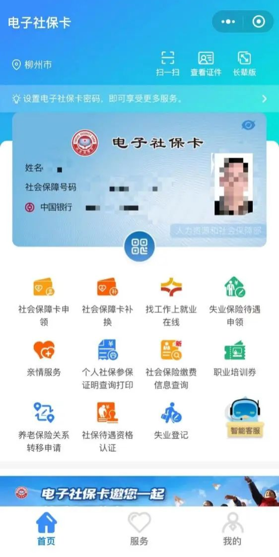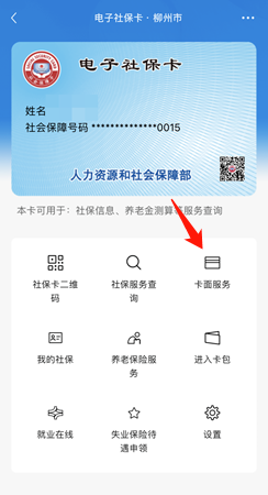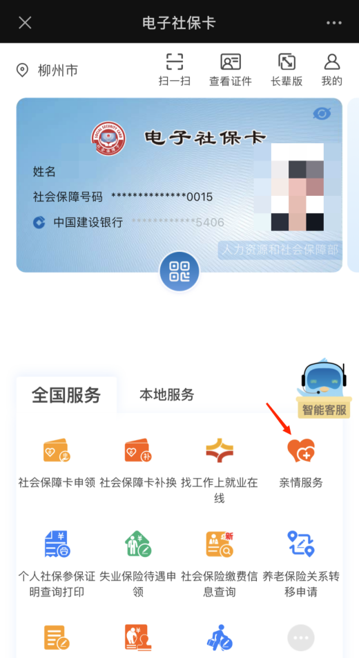 方法二:通过“广西人社服务”微信公众号申领电子社保卡的人员,进入电子社保卡首页后,点击“卡面服务”,进入“卡面服务”后点击“亲情服务”;