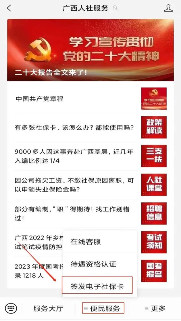 2.点击菜单栏“便民服务”-“签发电子社保卡”-“立即领取”;