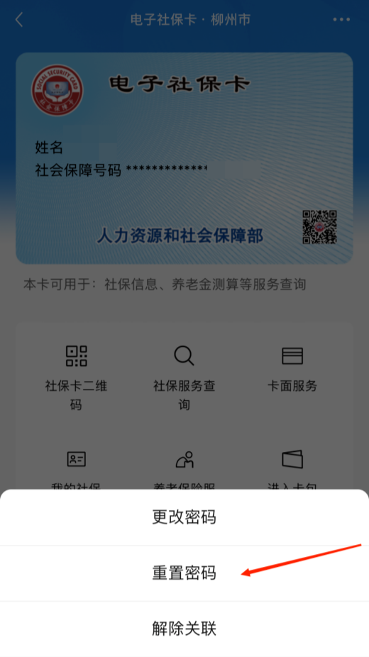 5.签领后请设置电子社保卡密码,微信支付密码默认为电子社保卡初始密码。可在电子社保卡界面,点击“设置”后在弹出菜单里选择“重置密码”选项进行新密码设置。