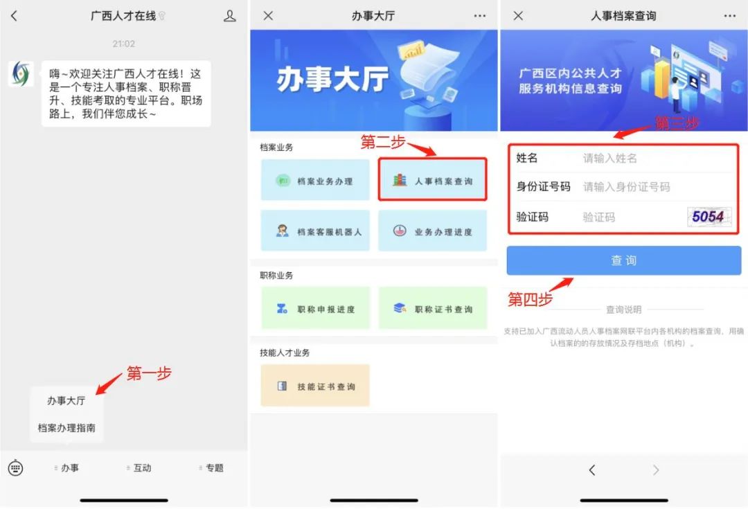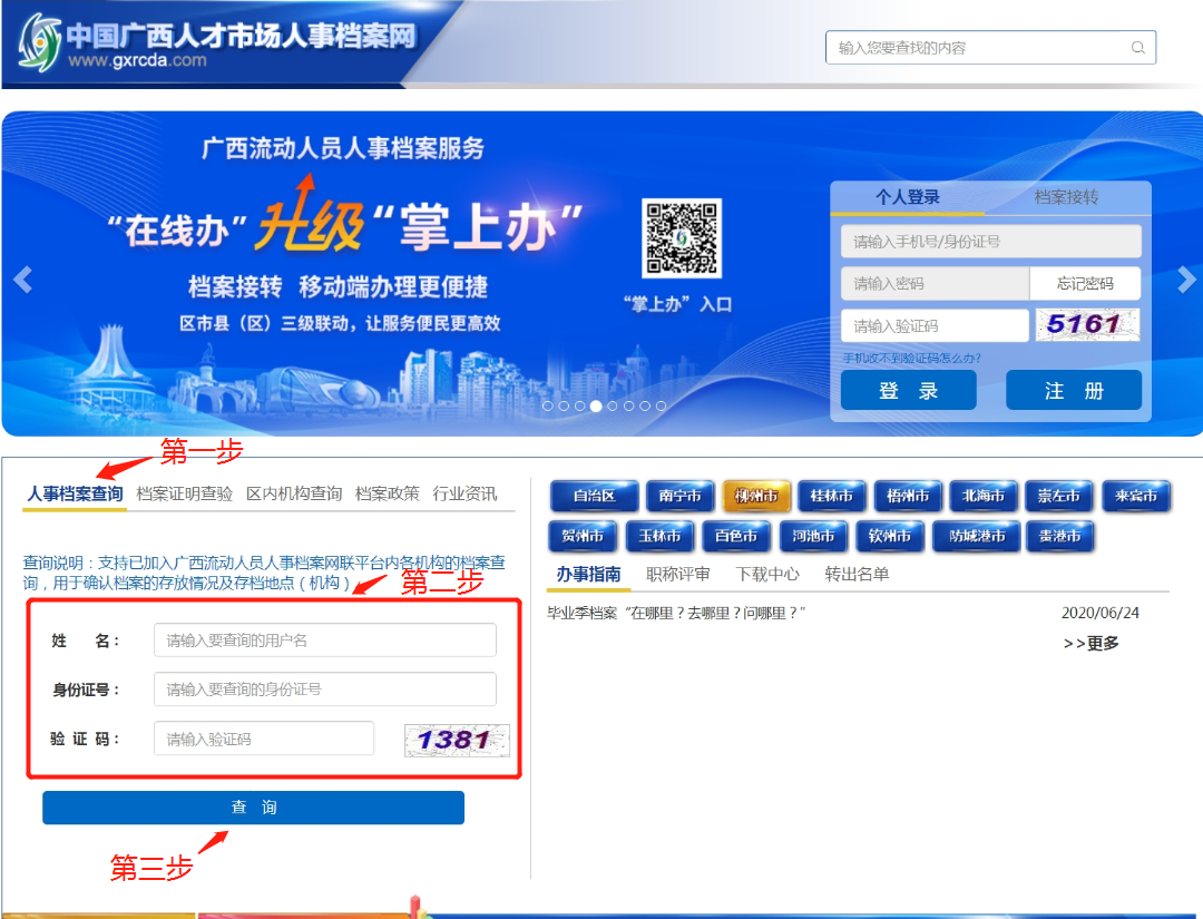 使用电脑登录“中国广西人才市场人事档案网”(网址:www.gxrcda.com),点击“人事档案查询”并填写个人信息,点击“查询”。