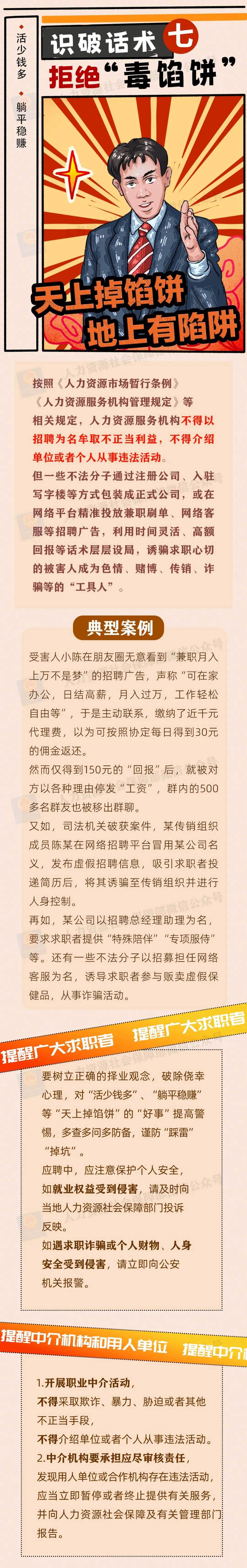 为加强风险防范,人力资源社会保障部、中央网信办、 教育部联合发布招聘欺诈典型案例,揭示不法分子的惯用手法和话术套路,帮助高校毕业生等广大求职者提高风险识别意识,增强自我保护能力。
