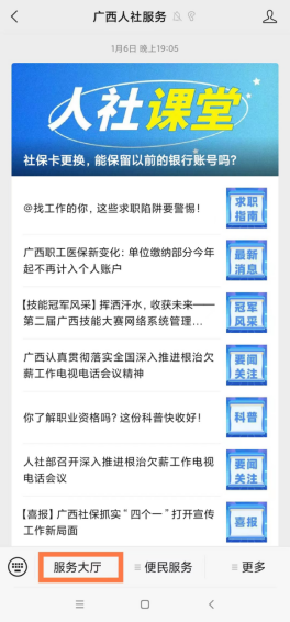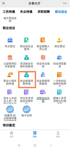 第一步:登录广西人社服务微信公众号首页,点击服务大厅>>>就业创业>>>创业担保贷款申请。