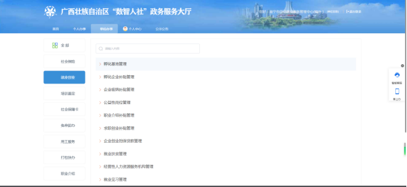 第一步:使用数字证书(CA证书)Ukey登录广西壮族自治区“数智人社”政务服务大厅,点击单位办事>>>就业创业>>>企业创业担保贷款申请。