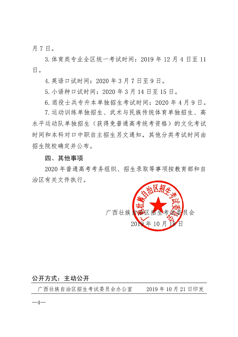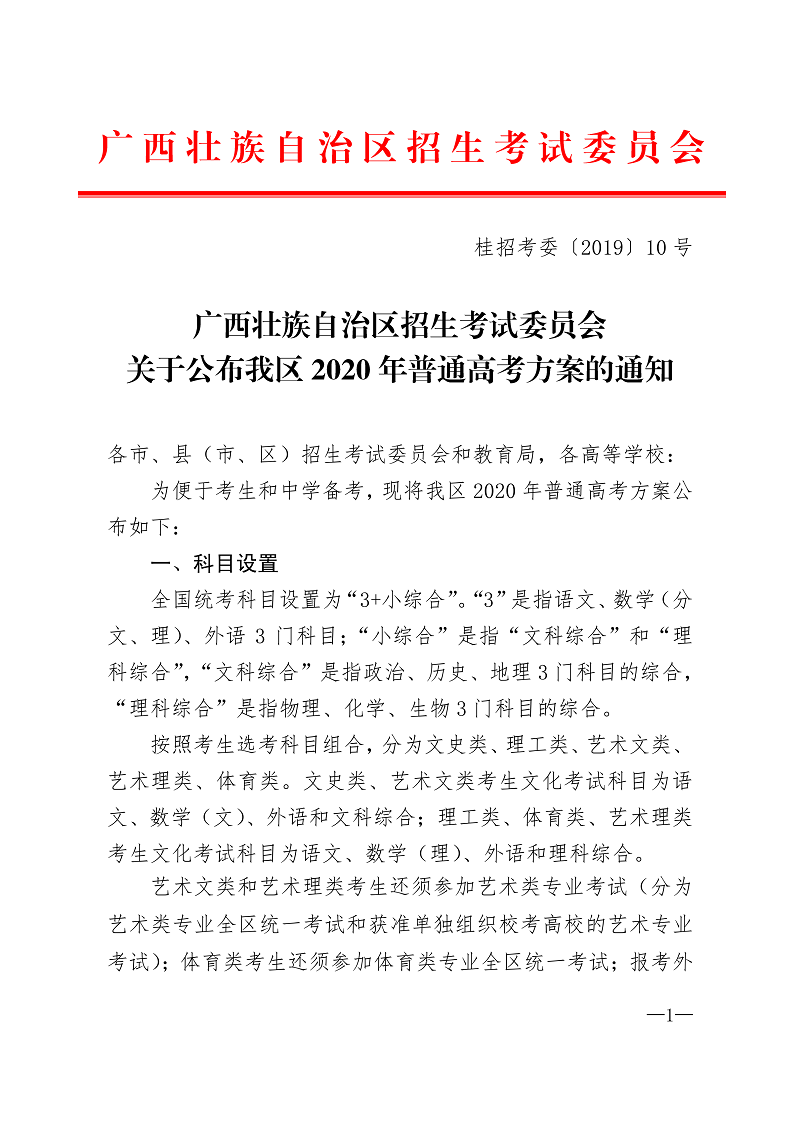 桂招考委〔2019〕10号 广西壮族自治区招生考试委员会关于公布我区2020年普通高考方案的通知