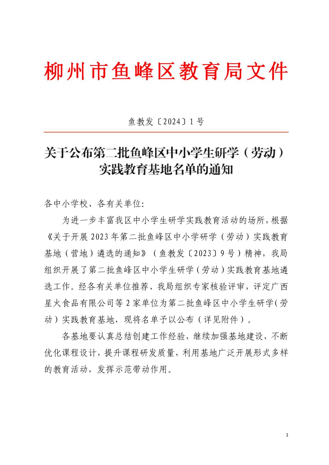 鱼教发〔2024〕1 号 关于公布第二批鱼峰区中小学生研学(劳动)实践教育基地名单的通知