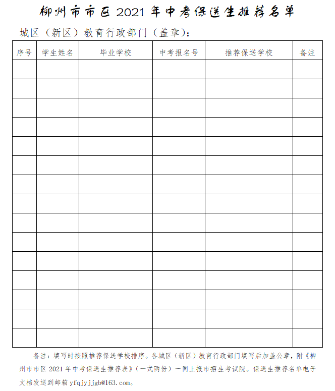 4.公示无异议后,由学校填写《柳州市2021年中考保送生推荐表》一式四份,交由学生本人、法定监护人签字后,加盖学校公章,并附学生获奖证明材料复印件(要求学校验明原件,在每一份复印件上签署“与原件相符”,加盖学校公章并由审验人签名),于2021年6月2日前上报我局教管办备选(学生获奖证明材料复印件一式四份)。