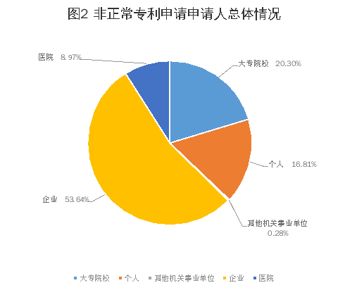 提交10件(含)以上非正常专利申请的申请人26个,涉及非正常专利申请546件,占总数51.56%。按申请人类型统计,16家企业涉及221件,5所大专院校涉及215件,3家医院涉及76件,2名个人涉及34件;按申请人所属行业统计(参照GB/T 4754-2017),教育业涉及215件,科技推广和应用服务业涉及123件,卫生行业涉及76件,软件和信息技术服务涉及43件,专业技术服务业涉及14件,通用设备制造业涉及11件,研究和试验发展/橡胶和塑料制品/电力、热力生产和供应业各涉及10件。除2名个人以外,24家单位均未接受我市知识产权领域以信用为基础的分级分类监管,未主动开展知识产权信用信息承诺、践诺。