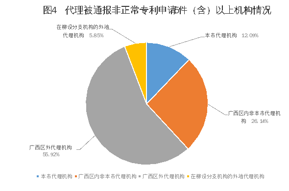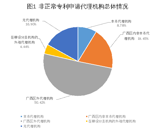 1059件非正常专利申请涉及申请人212个,其中,企业114家、568件、占比53.64%,大专院校5所、215件、占比20.30%,医院6家、95件、占比8.97%,自然人85人、178件、占比16.81%,其他机关事业单位2个、3件、占比0.28%;涉及专利代理机构91家,其中,广西区外代理机构76家、534件、占比50.42%,广西区内非本市代理机构7家、206件、占比19.45%,本市代理机构3家、93件、占比8.78%,在柳设分支机构的外地代理机构5家、47件、占比4.44%;另有179件未通过代理机构提交,占比16.90%。