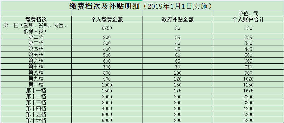 (三)缴费档次及补贴明细(2019年1月1日实施)