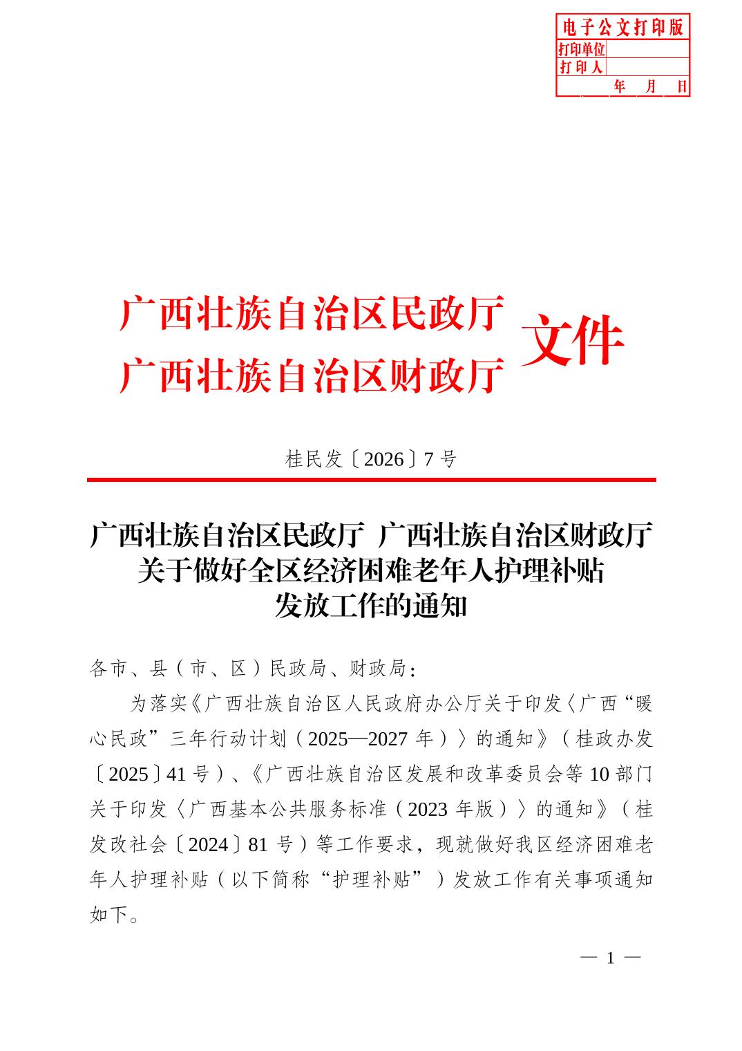 广西壮族自治区民政厅广西壮族自治区财政厅关于做好全区经济困难老年人护理补贴发放工作的通知